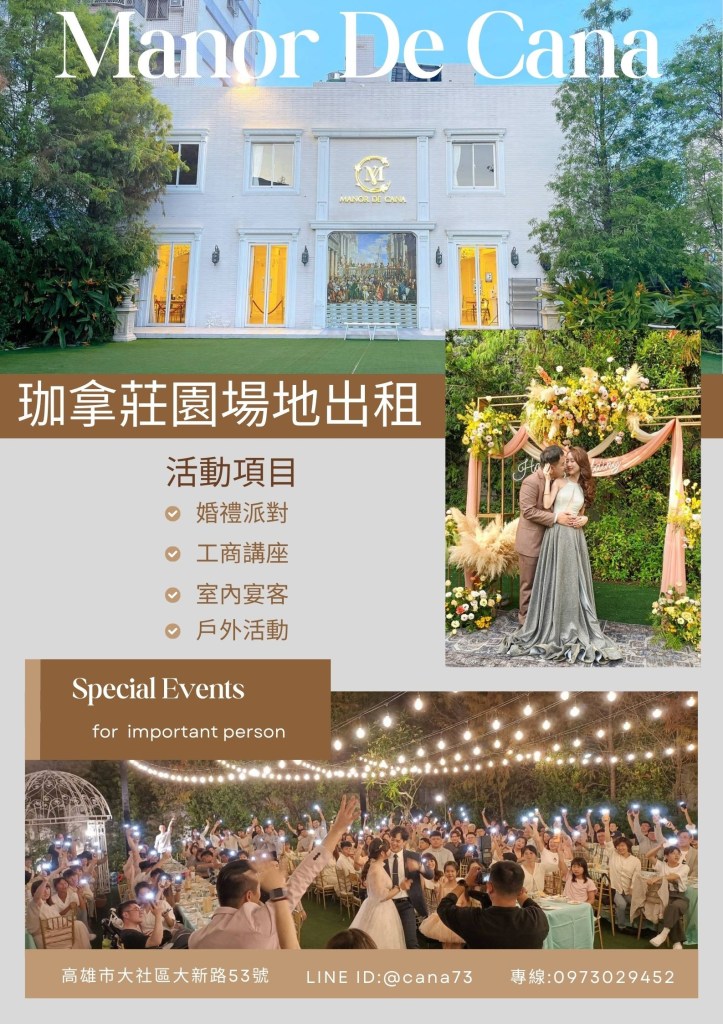 戶外草坪婚禮、精緻小型婚宴一次擁有!珈拿莊園提供高雄最浪漫的18桌草坪與12桌水晶燈廳,各種專屬包套方案搭配選擇,讓你的婚禮與眾不同。 #戶外婚禮#小型婚禮#高雄婚禮場地